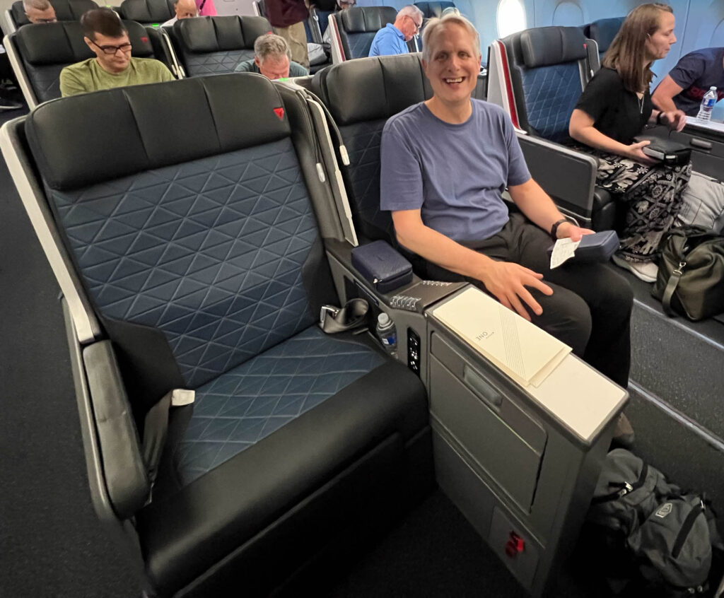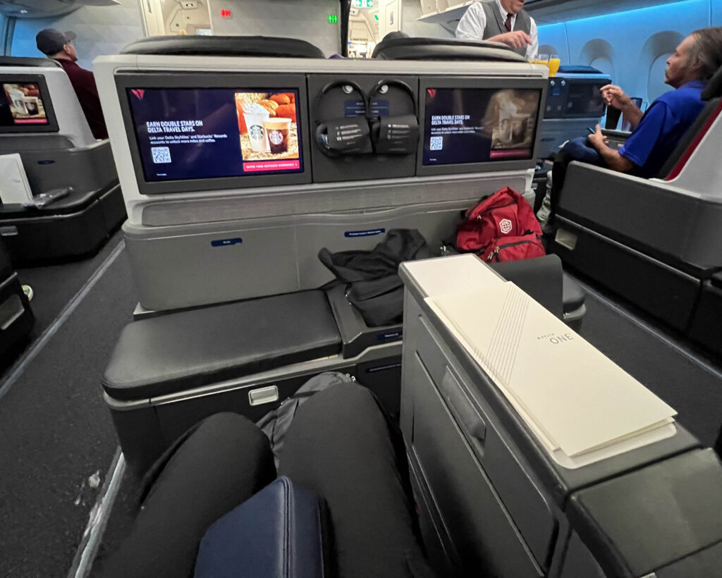 Our flight was from Denver to Atlanta to Barcelona. For the long flight to Barcelona we flew first class! Here are our seats for the 10 hr flight..