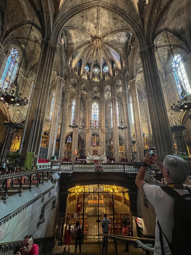Ah… finally, we visited the Barcelona Cathedral. We visited a lot of cathedrals in Spain. They are all beautiful, each having their own special thing. Barcelona Cathedral was neat because we could go up on the roof without a tour. Here’s a grand view inside…