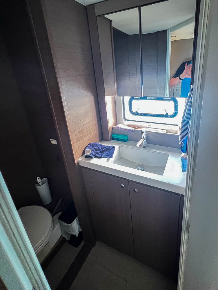Here is the area where we’ll spend most of our lounging time. This particular brand of boat (Bali) is really neat. The sliding glass door you see rotates up to the ceiling with the touch of a button! Then you can open the windows along the sides so the lounging area is completely open to the breezes. But, it if was rainy, you can close it up like this. Totally cool! During the day, this area was always open. Joran just closed it when everyone went to bed at night.