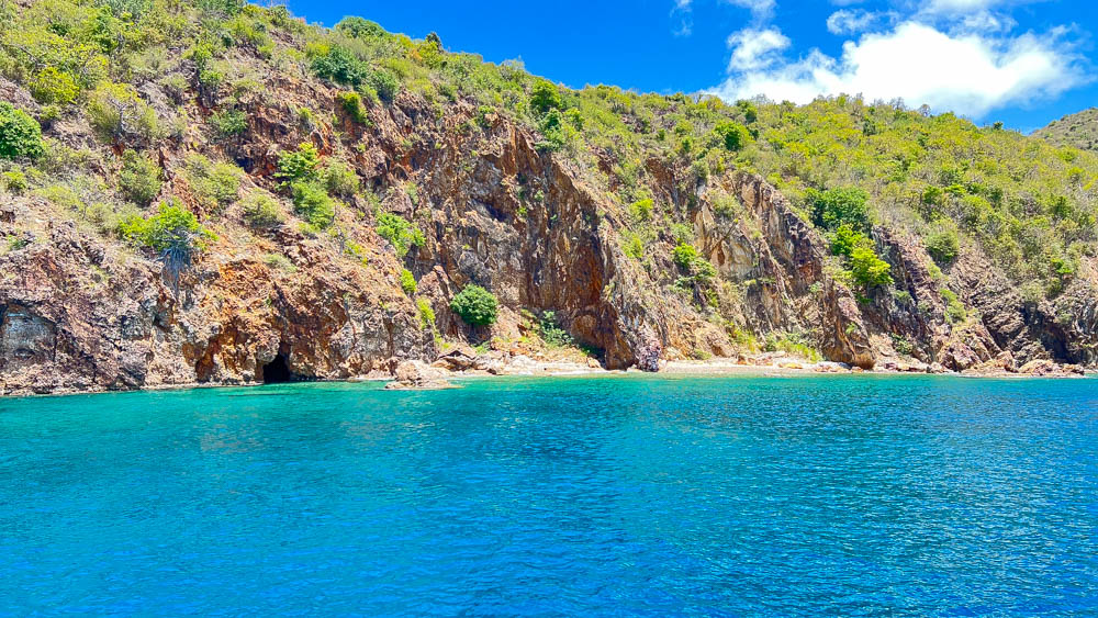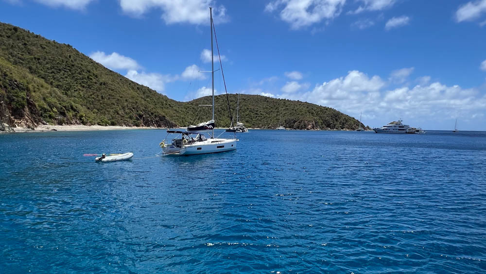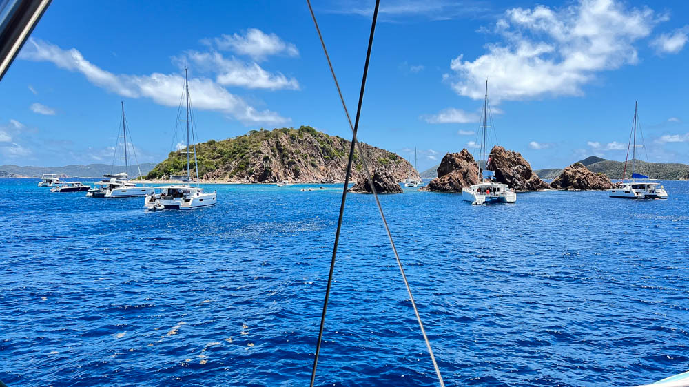 Here we are arriving at Privateer Bay on Norman Island, where were anchored for the night.