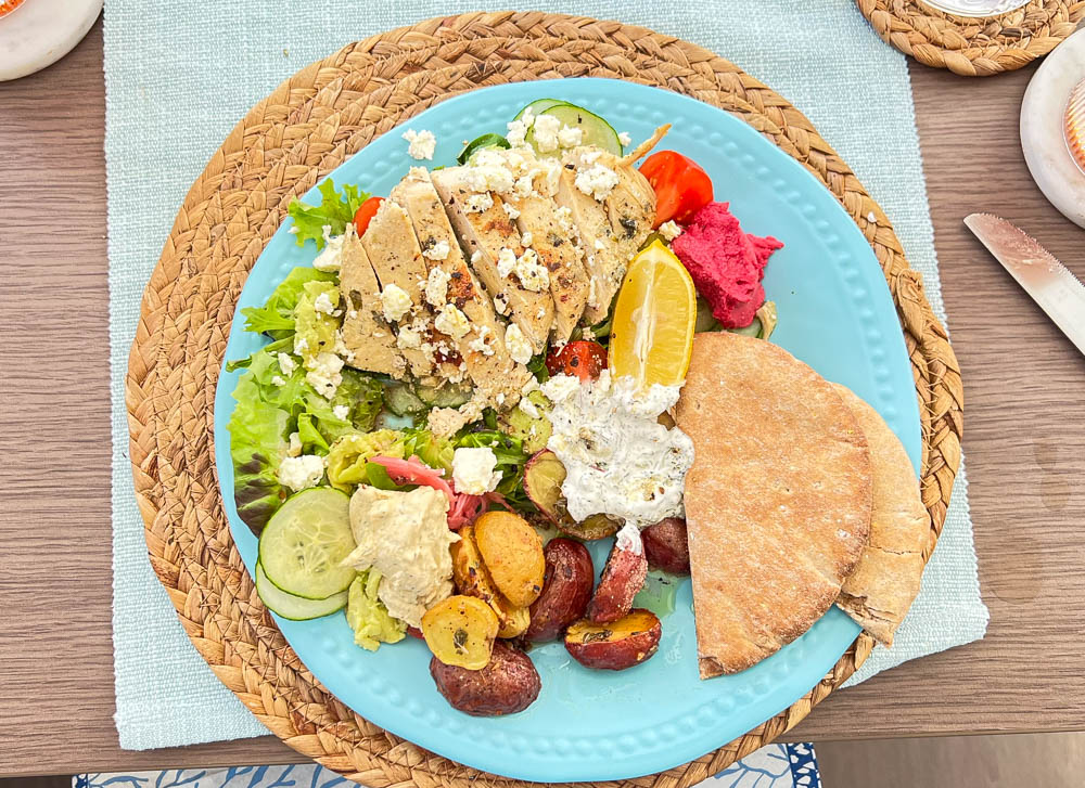 Lunch had a fabulous Greek theme of yogurt-marinated chicken over a Greek salad, served with roasted potatoes and pita bread. Another Yum!