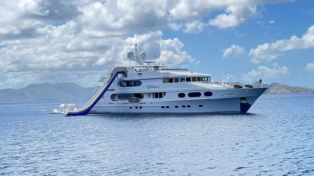 In the distance of the above picture, you can see a megayacht. Wow! That yacht was huge and had all kinds of water toys! Below you can see they have a giant slide down to the water. And the white thing at the bottom of the slide is a floating lounge area. It has seating and a cover to protect from the sun.