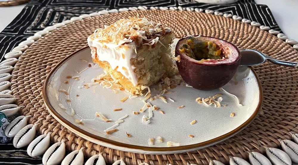 For dessert, she made a coconut cake and served it with half a passion fruit. The passion fruit is VERY tart, so the idea was to contrast the sweetness of the cake with the tart of the fruit. Casey makes the most interesting combo of flavors for all of her meals.