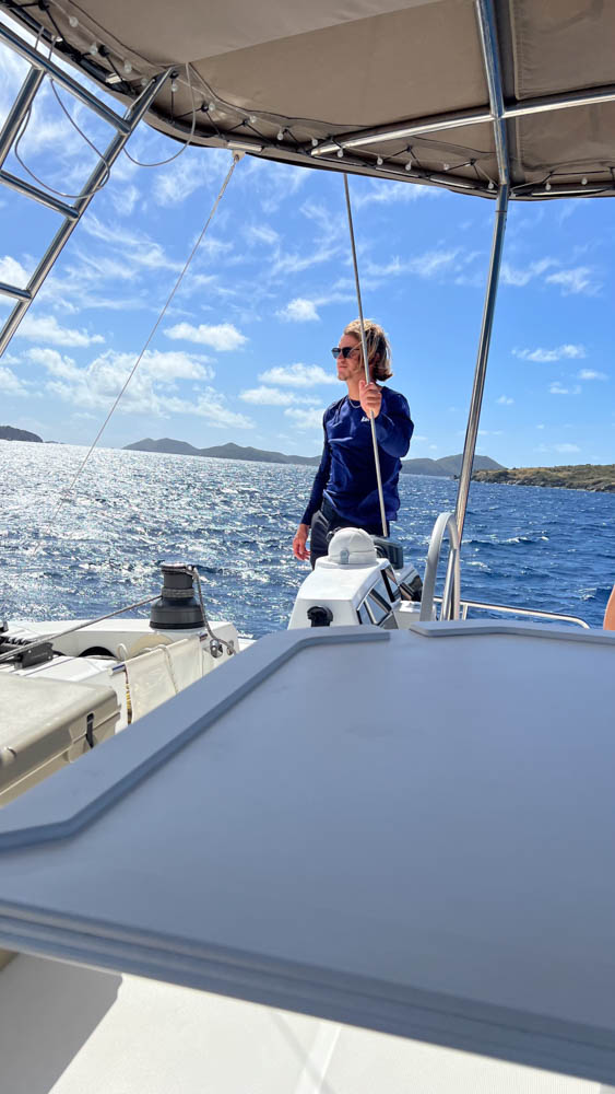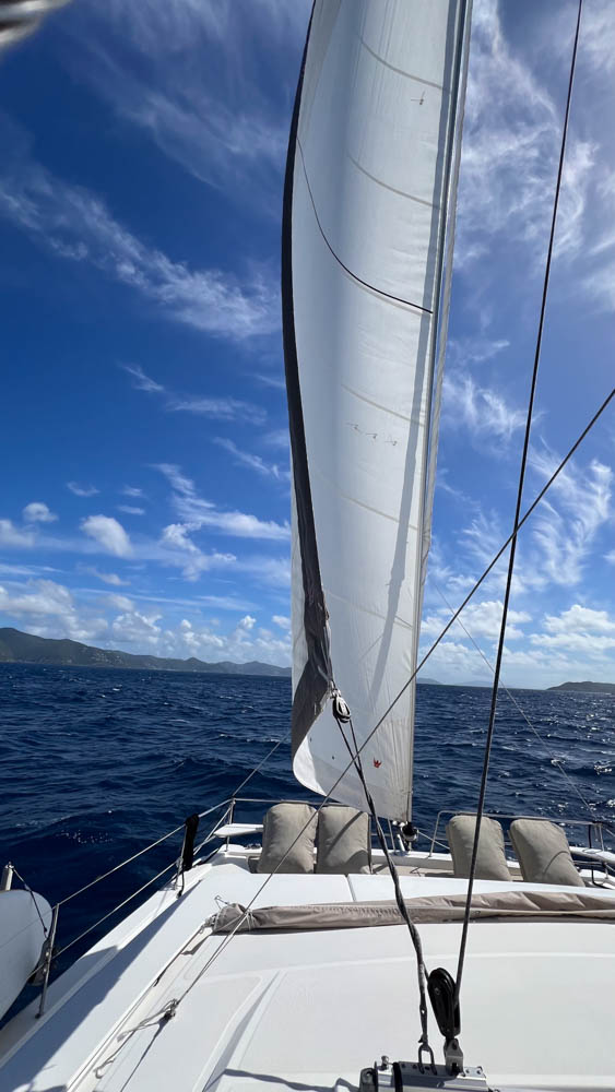 To get to Tortola, Joran used the sail for part of the trip. It was so beautiful and very interesting to see how easy it was to get the large sail up and then back down and away when finished. I wish I was able to get a picture of Koru from a distance with the sail up! Well, here is what I was able to get from the flybridge …