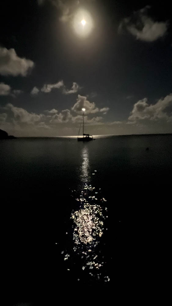 We anchored overnight at Lameshur Bay on St John Island. I got up early before everyone else was awake (as usual). The moon made a beautiful glow across the water, with that other sailboat in a perfect location for this picture. Great picture for using an iPhone!