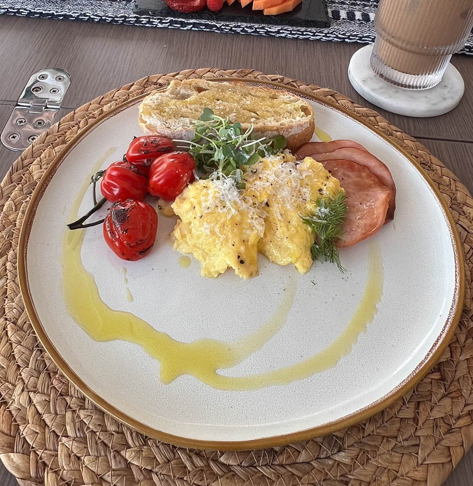 First, we had to fuel up with breakfast! Today, we have an egg scramble with fire roasted tomatoes and Canadian bacon.