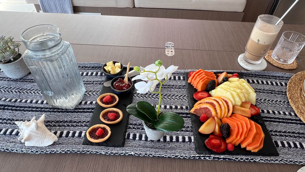 Casey also put together a beautiful fruit plate and raspberry tarts on the other slate. And, she makes us iced mocha coffee drinks with our breakfasts. Yum!
