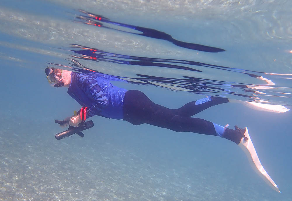 Jeff took a pic of me, also holding a sea scooter. As you can see, we are wearing our leggings and rashguards (the long-sleeved tops). I also wear a wetsuit vest – otherwise, get cold in the water too quickly.