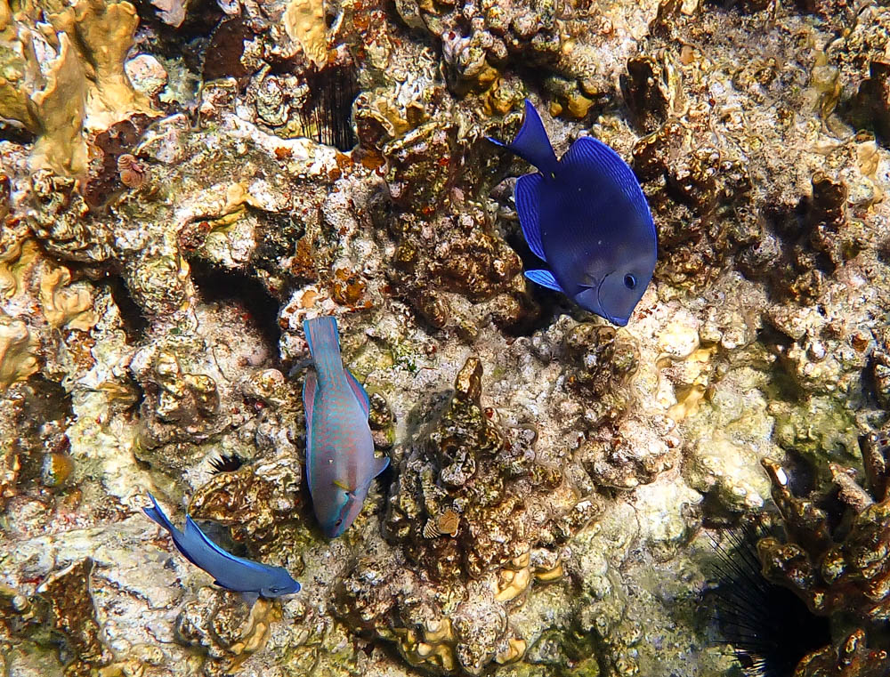 This pic has two Caribbean Blue Tangs and a small Parrotfish.