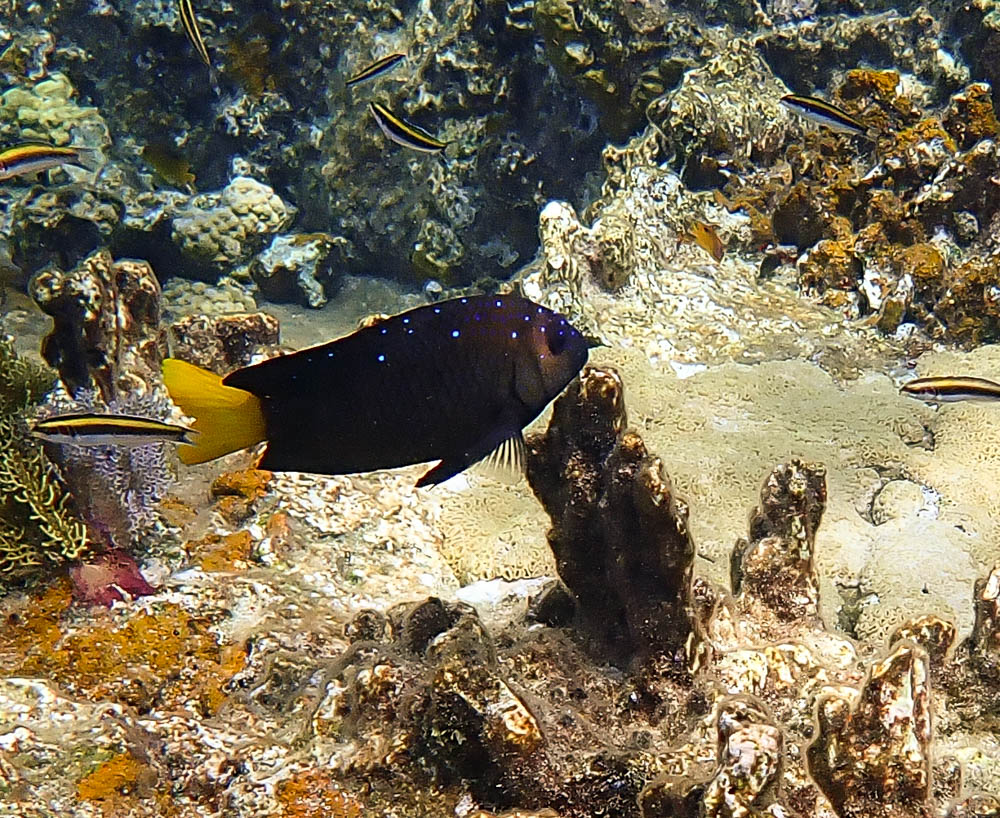 Here, there is an adult Yellowtail Damselfish. Many of their blue spots fade as they age.
