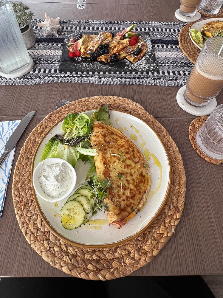 But first, we had breakfast! Casey made savory and sweet crepes. Yum! The sweet crepes are in the middle of the table with the fruit.