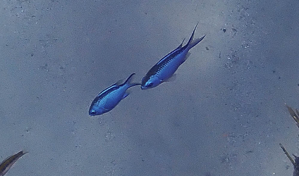 We saw a fish here that we had never seen before – a Blue Reef Chromis. This was the only time we saw this fish during our entire trip. They are tiny – maybe 2″ long.