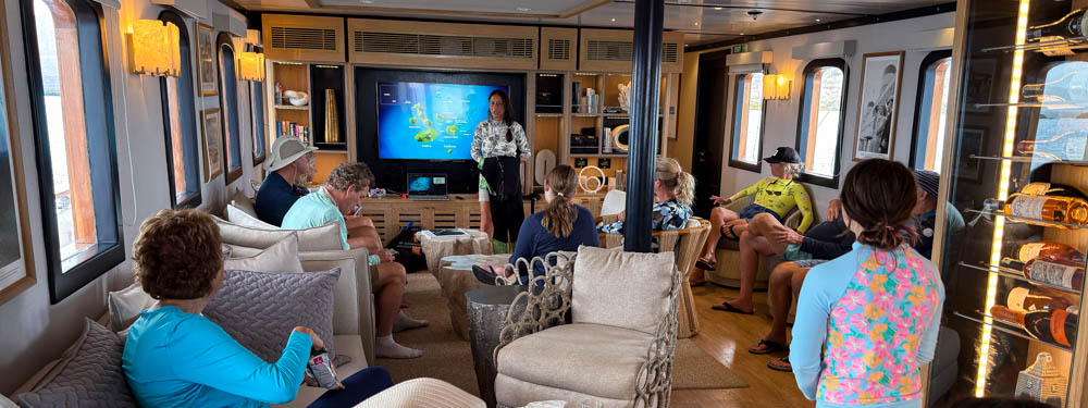 It’s not actually the afternoon yet – it’s only 10:30am. But, we’re back on the boat, and Monica gave us a briefing about our first snorkeling adventure. This is the lounge where daily briefings are held.