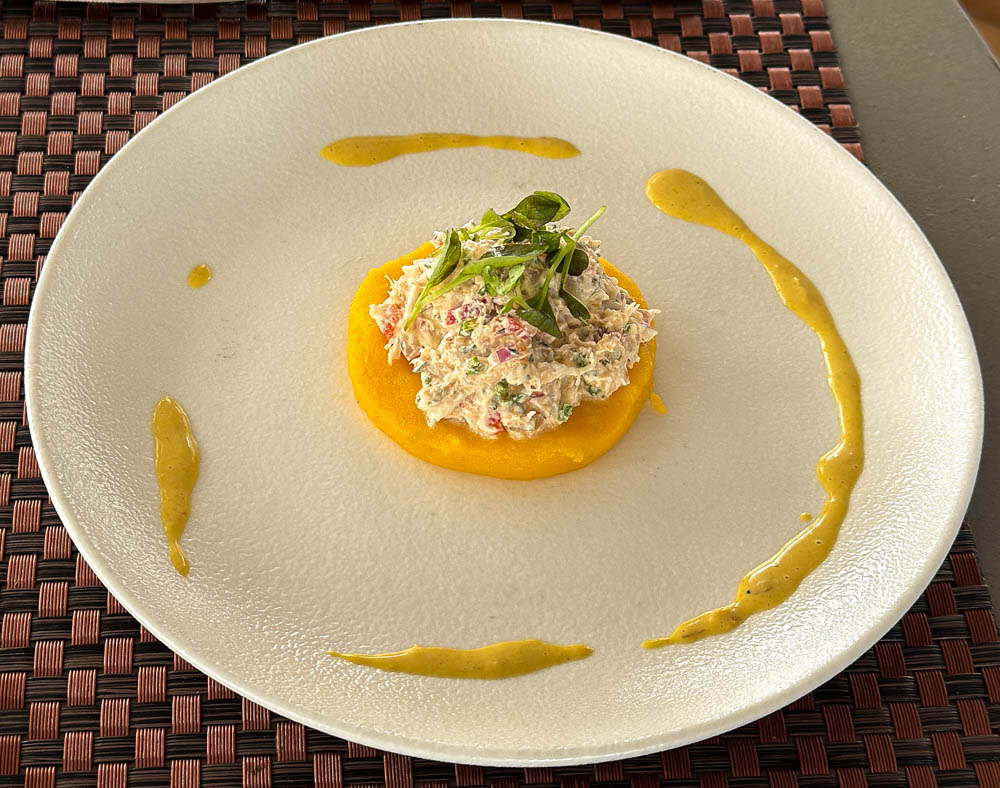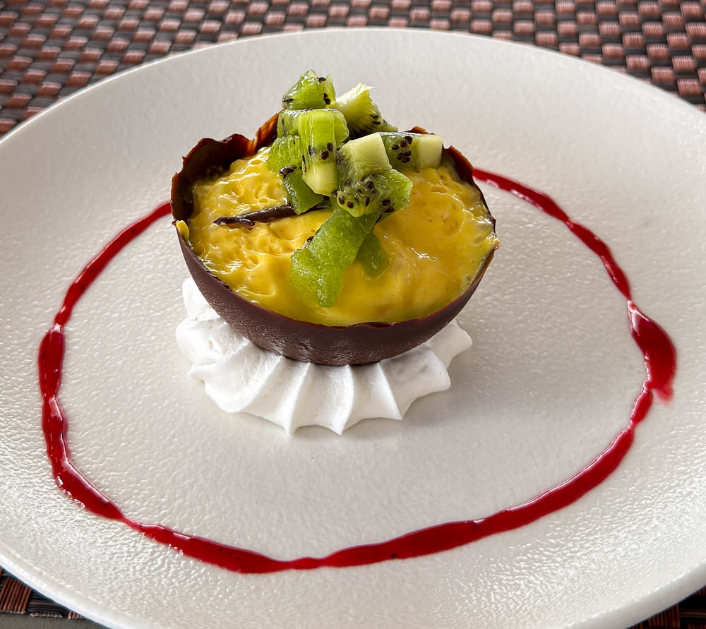 For lunch, we finally remembered to take a couple of pictures. On the left is the starter, a crab salad. Then dessert, which was a delicious passion fruit mousse topped with kiwi in a chocolate cup. Everything always looks so pretty!