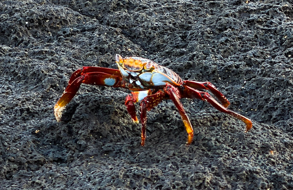 This is not the crab making the above holes and art… this is the Galapagos version of the Sally Lightfoot Crab. They are all over the rocks and can be super colorful.