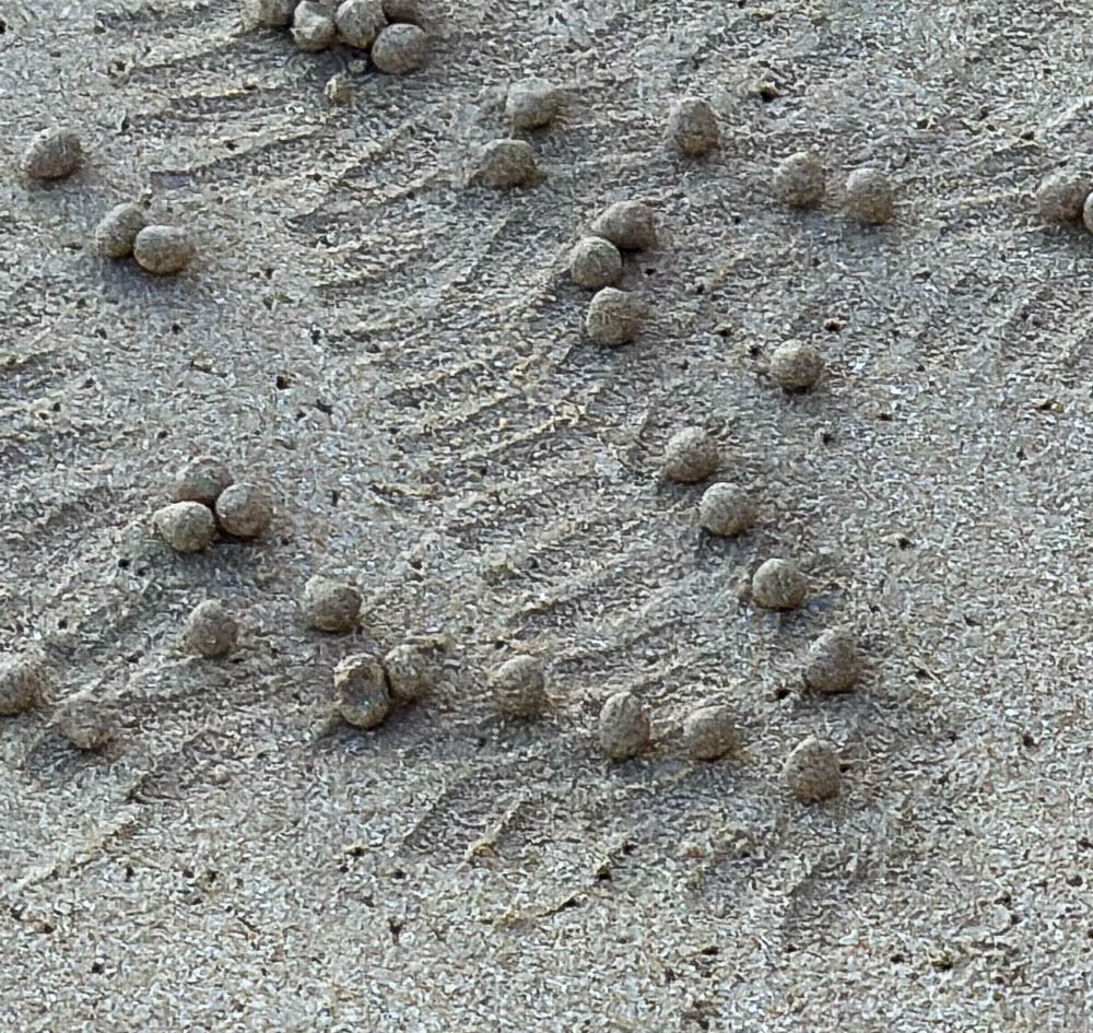 You can see each scrape to scoop up the sand, then the little ball they leave behind. Here’s a closeup…