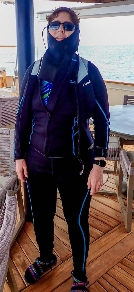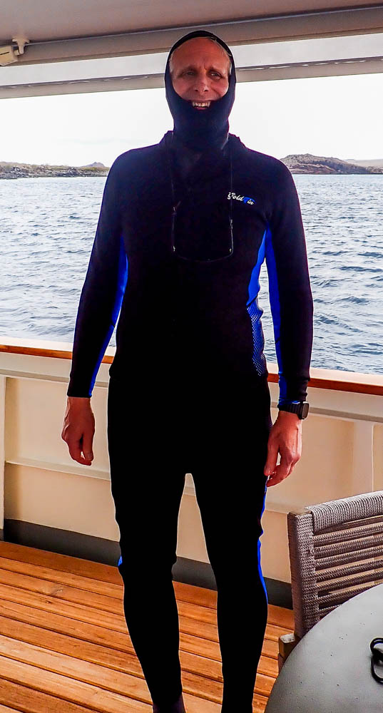The water in the Galápagos is cold! Jeff was able to see the temps on his watch, and it was usually 68-69 degrees. A few spots were warmer, though; it got up to 74 at one location! These temps meant full wetsuits were required.