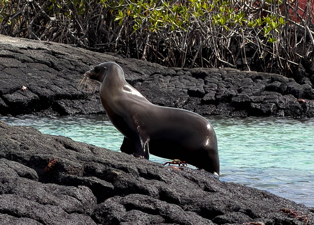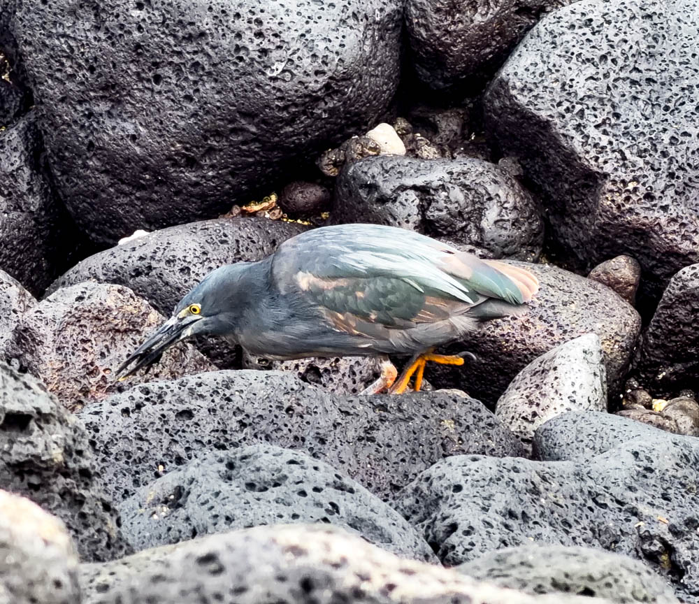We also saw a Lava Heron, which is endemic to the Galápagos. This one just caught a small crab! It’s hard to see, but it’s in his beak. With their coloring, you can see why they are named after the color of lava.