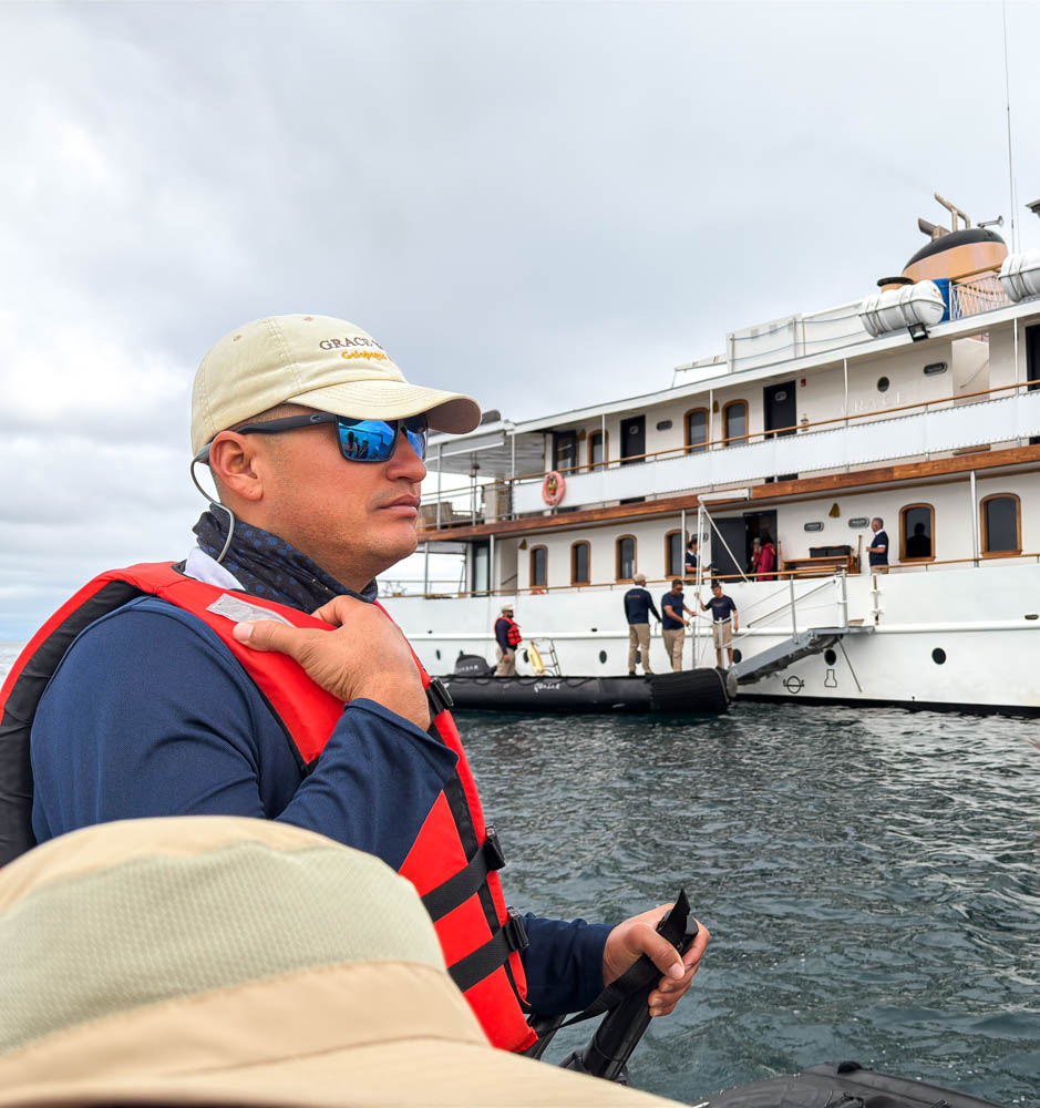 In Spanish, the small dinghy boat we used to get ashore is called a panga. I’ll probably use both names as I write this blog. So, you’ll need to remember what panga means! You can see the panga against the side of The Grace, waiting for other passengers to load up.