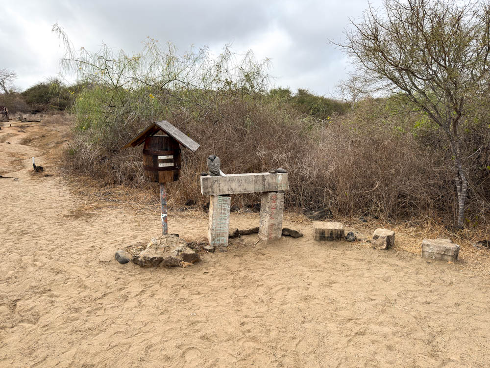 This is our destination – the original “post office” for the Galápagos! Way back in 1793, British whalers set up this barrel to send letters home via other passing ships. The idea was that sailors would drop addressed letters in the barrel, and future sailors would go through and find letters to their destination. Then, they would hand-deliver the letters. Wow, it must have taken a long time to get a letter with that system!
