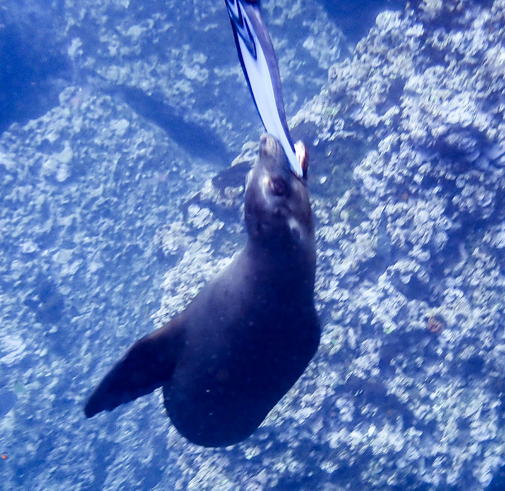 After that, this sea lion swam directly to me and chomped my elbow!! Luckily, with the wetsuit layers, I didn’t have any problems from the teeth. 😮