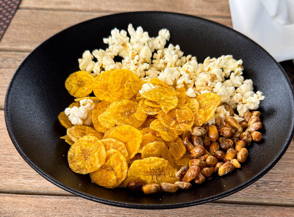 We started with this delicious soup. An interesting thing is that they like to add crunchy things to their soup. So they also set out a bowl of popcorn, baked plantains (similar to bananas) and their crunchy/hard corn. You are supposed to sprinkle these on your soup. The plantains were yummy, I just ate them as my snack. 😉