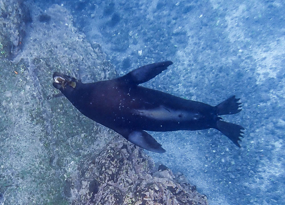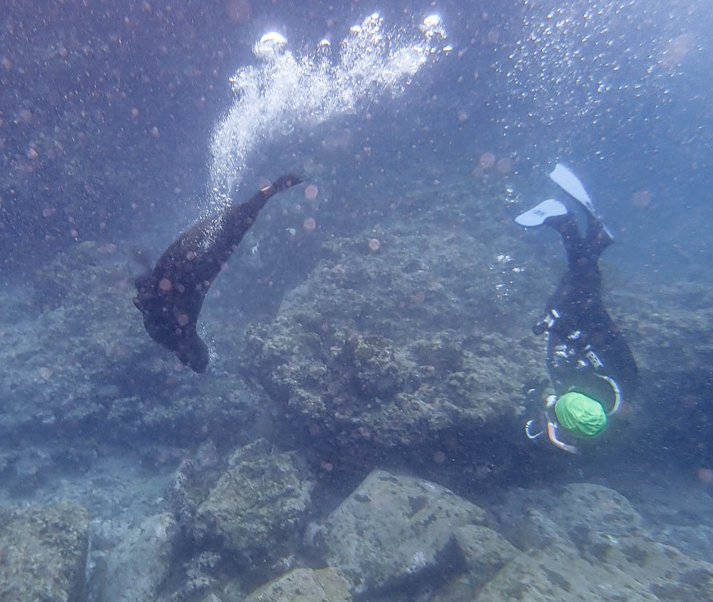 The highlight of this snorkel was swimming with the very playful sea lions. There were a few of them swimming around everyone, trying to get us to play. This one was trying hard to get Cornelia (one of our guides) to play with her. They blow bubbles as part of the fun. There were a number of times during our trip we had sea lions swim right up to our mask and blow bubbles – really awesome!!