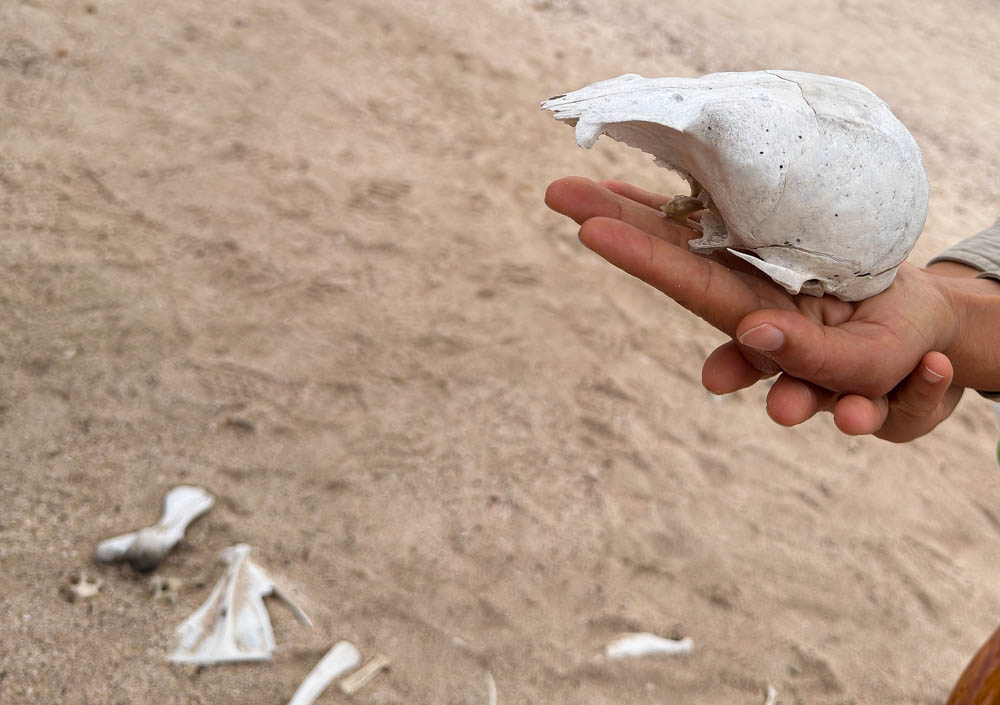 In one area, we found the skeleton of a sea lion. Here, Monica is holding the skull. I think she said this was a young one.