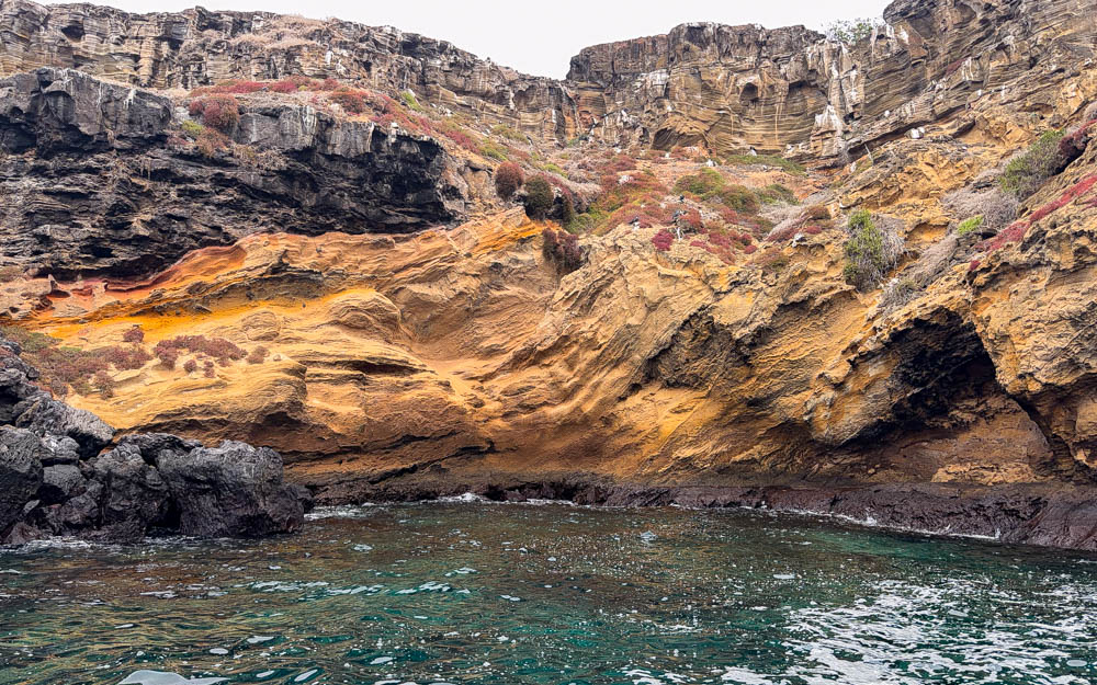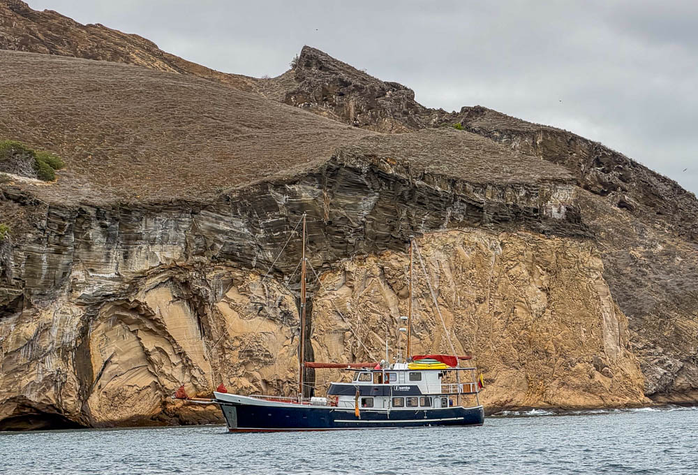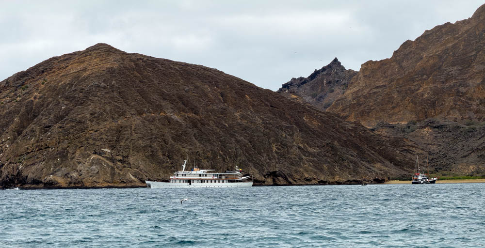 After returning to the Punta Pitt area from our dolphin adventure, it was too late to do the hike that was originally planned. Since we had a bit of time, the pangas motored us around the island shoreline. We got a nice picture of our boat, along with another much smaller boat that we saw at many of our stops after this. Here, you can see the size difference.