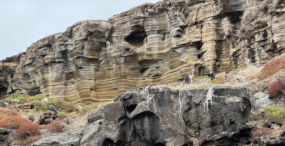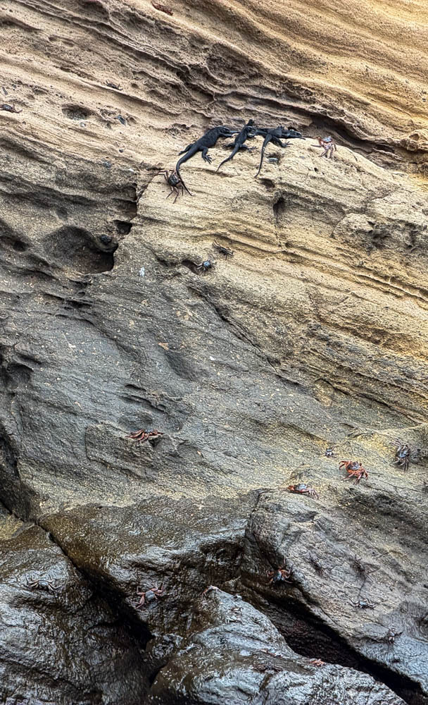 Along the water, there were marine iguanas clinging to the rock face. You can see how far up they climbed – the waves left the rocks at the bottom wet.