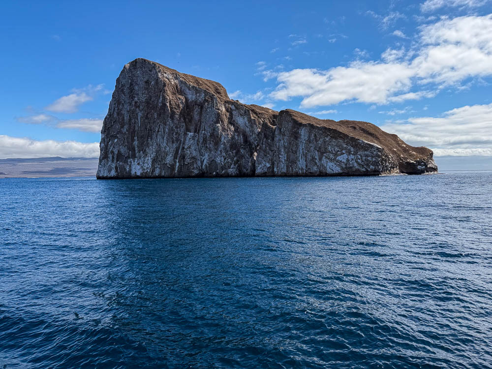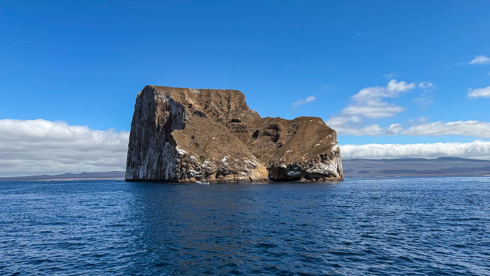 We navigate around Kicker Rock. The names of this rock are confusing to me! The Spanish name is Léon Dormido, which means “sleeping lion”, because they thought this formation looks like a male lion sleeping. The English name is Kicker Rock, because they thought it looked like a boot. Hmmm… I didn’t see either of those in the shapes as we passed – judge for yourself with the pictures below…