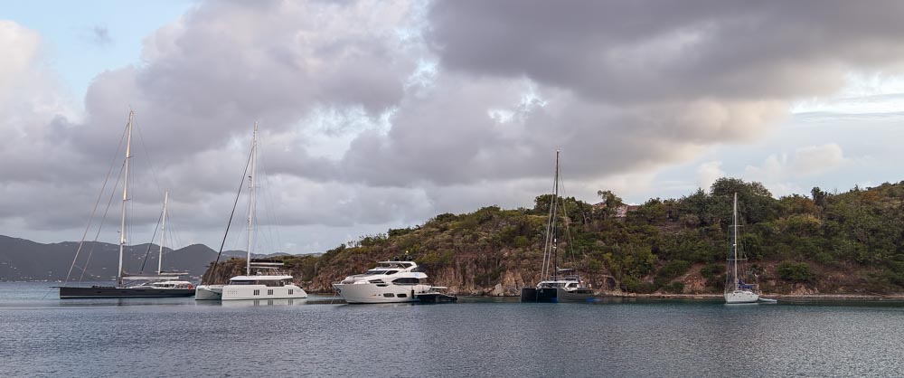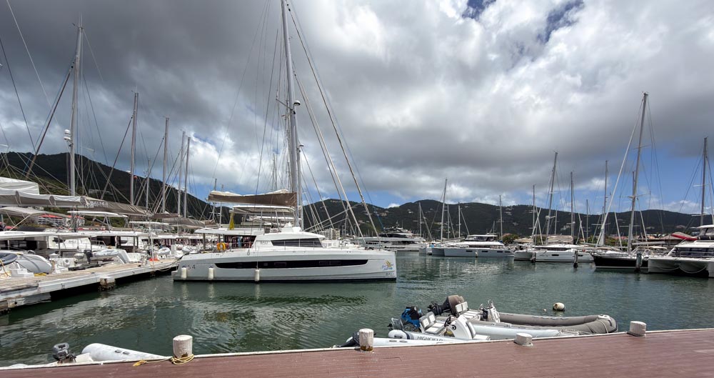 Our fabulous crew – Rob (the captain) and Julia (the first mate & chef) – met us at the Village Cay marina. Dream On was docked there to pick us up; we didn’t stay there overnight. This was our view as we waited for them to pick us up – and this is only 1 of the 3 docks.