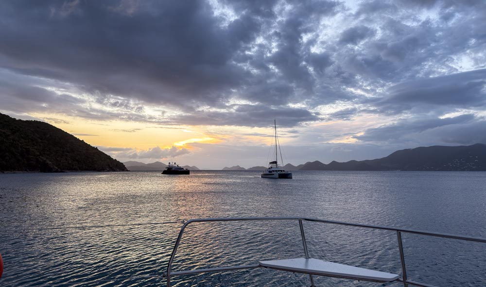 Our first stop was Little Harbor on Peter Island. We weren’t planning to snorkel here, but it was a nice calm place to moor for the night. Sunset lit up the sky…