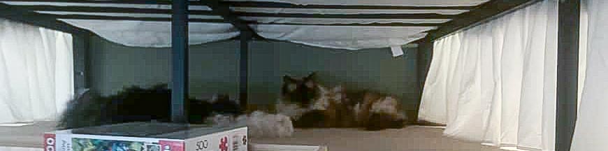usuallyThe cats like to hang out under Raquel’s bed. We usually have the guest room door shut, so now that it’s open, the cats want to spend time there. This picture is Mocha with Lexi under the bed. The black blob stretched out with the white leg sticking out (on the left side) is Lexi. She loves to be wherever Mocha is.
