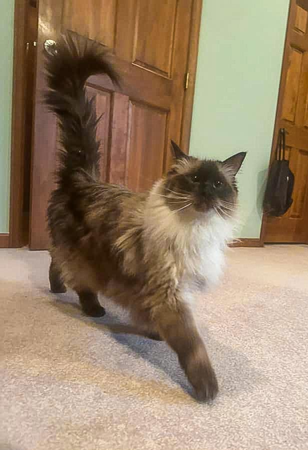 Meanwhile, back at our house with our house sitter ( Raquel), all our critters are settling in. Here is a great pic Raquel sent us of Mocha prancing into her bedroom.