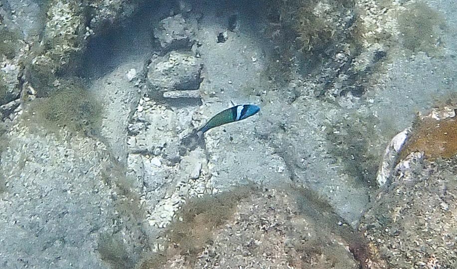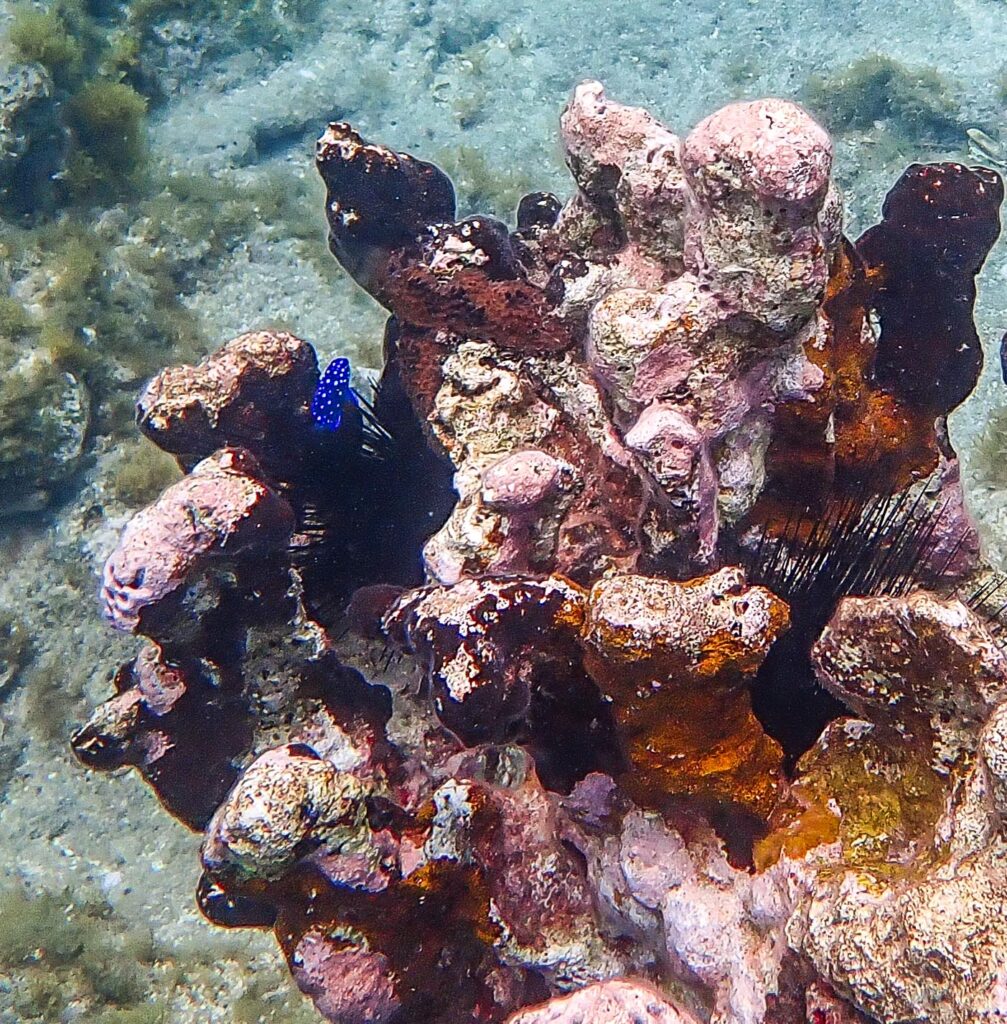 There was one area that had some interesting coral formations, with little fish darting in and out of the crevices. Here you can see the pink of the coral and a tiny juvenile Yellowtail Damselfish. They lose their spots and change color as they grow into adults.